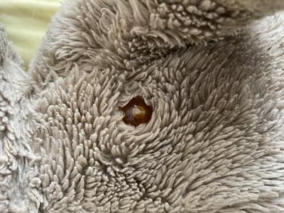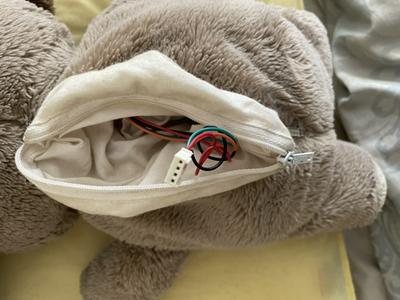 He used to talk when his left paw was squeezed but as you can see, his voice box has been removed (there is a 4 pin connector left inside).